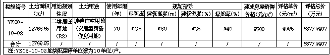 根据有资质的土地评估中介机构评估,并经评估专家小组评审通过,该宗地土地评估单价为4995元/m2(折合333万元/亩),土地评估总价为6377.9407万元。综上,鉴于该宗地为收回国有存量建设用地,不涉及耕地占用税、耕地开垦费、新增建设用地有偿使用费等问题。因此,确定该宗地挂牌出让起始价为6378万元。根据《海南省建设用地出让控制指标(试行)》规定,鉴于三亚崖州湾科技城控规YK08-10-02地块在省级六类产业园区范围内(原三亚创意产业园),地块规划用地性质为二类居住用地,拟建设安居型商品住房项目,对应土地用途为城镇住宅用地(安居型商品住房用地),属房地产业中的住宅用地,因此不设出让控制指标。以上出让控制指标按规定列入《海南省产业项目发展和用地准入协议》,属该协议内容的组成部分。同时,三亚崖州湾科技城管理局对该宗地产业指标及项目建设开发另有要求的,按其相关要求执行,并列入《海南省产业项目发展和用地准入协议》。