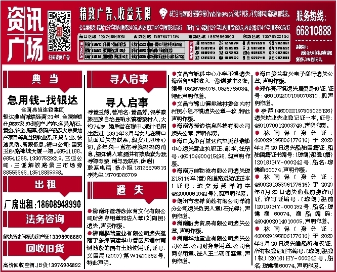 银达典当诚信经营23年,全国连锁分店25家,办理房产、汽车、名表、钻石、黄金、铂金、股票、数码产品及大宗房地产项目等典当贷款业务。正规专业、快速灵活、高额低息。海口公司:国贸玉沙路椰城大厦一层。68541188、68541288、13307529219。三亚公司:三亚解放路第三市场旁 88558868,13518885998。