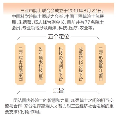 在院士工作站取得成果的基础上,2019年初,三亚市决定成立院士联合会,目的在于团结国内外院士的智慧和力量,加强院士之间的相互交流与合作,充分发挥高端人才智力对三亚经济社会发展的重要支撑和引领作用,服务和推动海南自贸港建设。