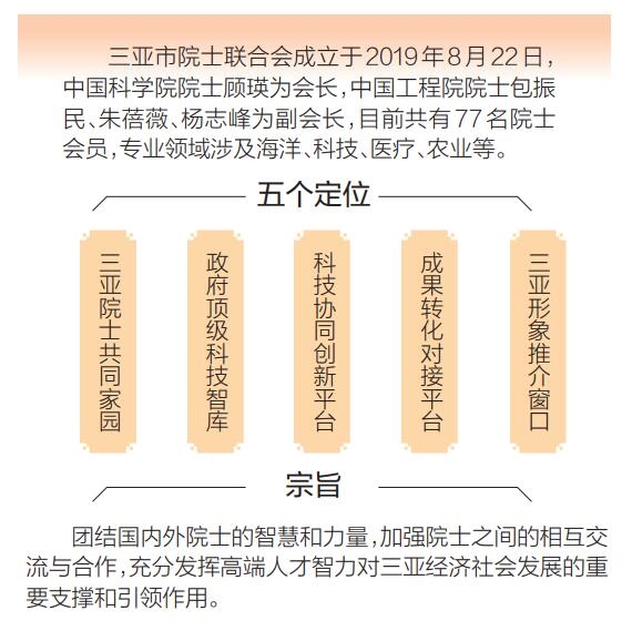 2019年8月22日,三亚市院士联合会成立。一年来,三亚市院士联合会发展步伐迈得扎实稳健,一幅院士参与三亚发展的壮丽画卷正铺开:从最初的36名会员发展到如今的77名会员,中国科学院院士顾瑛、朱蓓薇等将科研团队和项目落户三亚,提升三亚科研实力及科研成果转换水平……