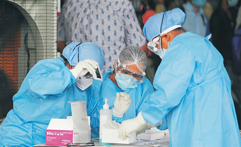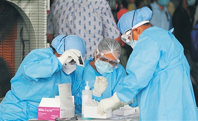 8月18日,医务人员在印度新德里为居民做新冠病毒检测采样。