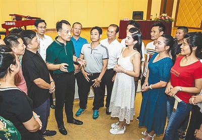 陈咏峰是原火箭军文工团独唱演员、著名男高音歌唱家,中国民族男高音声乐艺术研究会会长,1999年毕业于中国音乐学院声乐系,2007年第六届中国音乐金钟奖全国声乐民族唱法金奖获得者。2018年,他作为文艺界领军人才被引进儋州市。图为陈咏峰与参加讲座的青年文艺工作者交流。特约记者 吴文生 摄影报道