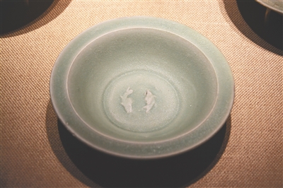 图3 元代青釉莲瓣纹双鱼洗。
