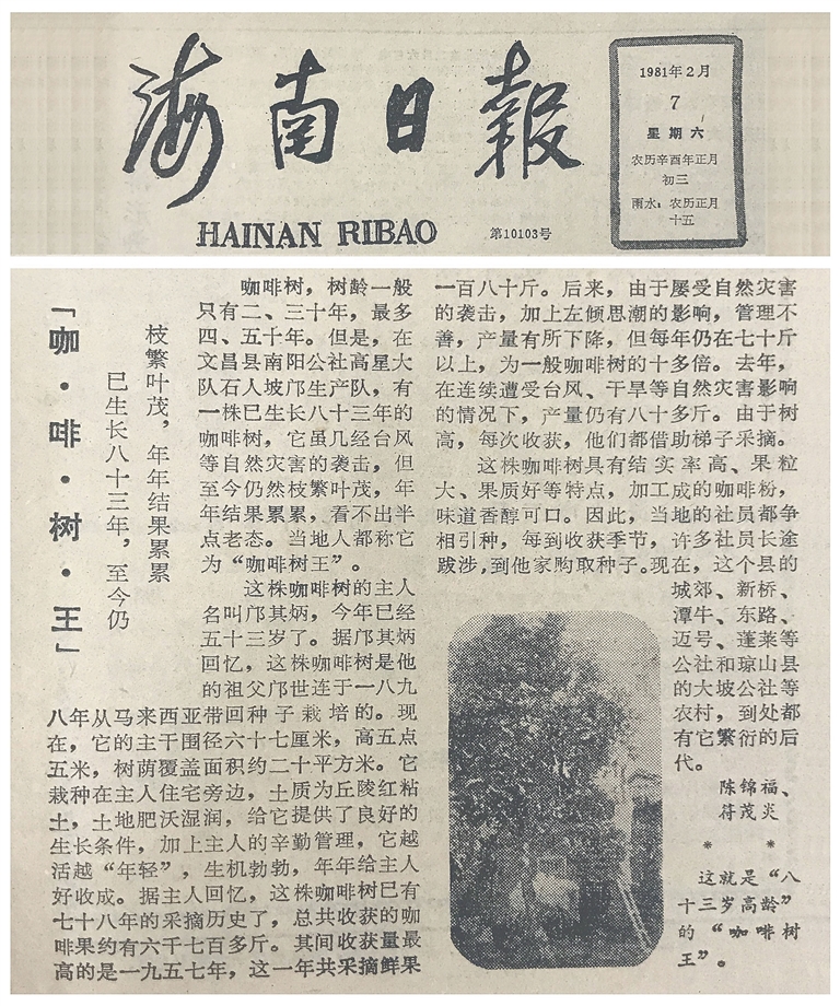 一般咖啡树的树龄在二三十年,多则四五十年,但这12株咖啡树却抗住了生命的代谢,在1981年2月7日出版的《海南日报》上,一篇题为“咖啡树王”的文章就记录下了这段历史: