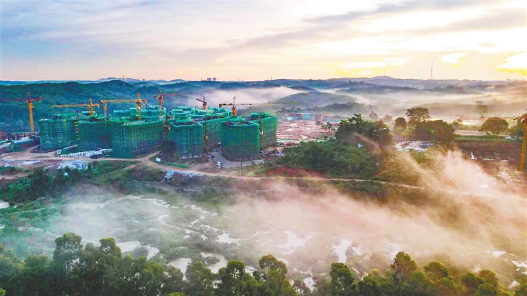 近日,俯瞰位于儋州市那大镇的海南电影学院项目施工现场,项目建设加快推进。据了解,海南电影学院项目总规划用地700亩,计划投资24亿元,预计2021年9月竣工。截至目前,该项目8栋学生宿舍楼全部封顶,教师公寓、综合楼和教学楼已完成桩基施工,体育馆、地下车库的桩基正在稳步推进中。本报记者 陈元才 摄