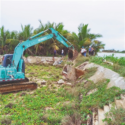 7月底,崖州区农业农村局、生态环境局、海洋水务局成立联合督导组,对养生岛无证养殖,未取得海水取水许可证、环评手续的鱼塘和虾塘进行了破坏性拆除工作。分管相关工作的副区长现场指导,协调解决清退过程中的难点、堵点问题,确保清退工作顺利完成。