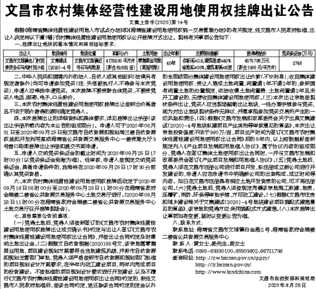 文昌市农村集体经营性建设用地使用权挂牌出让公告