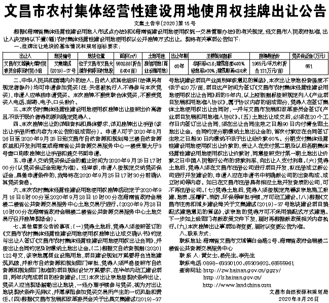 文昌市农村集体经营性建设用地使用权挂牌出让公告