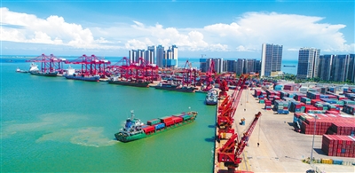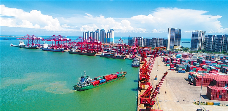 8月25日,在海口港集装箱码头,装载集装箱的货轮正在靠岸,码头一片繁忙景象。