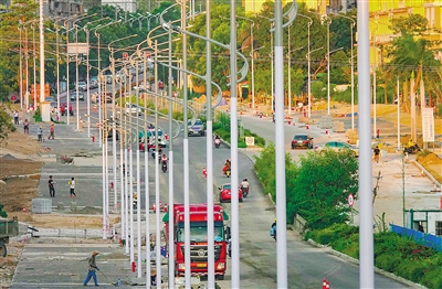 8月25日,在昌江黎族自治县石碌镇环城西路改造项目施工现场,工人正在进行人行道、绿化带施工,部分路段已安装路灯。环城西路是石碌镇的主干道之一,该项目完工后,昌江县城的交通硬件条件将进一步改善。本报记者 陈元才 通讯员 杨耀科 图/文