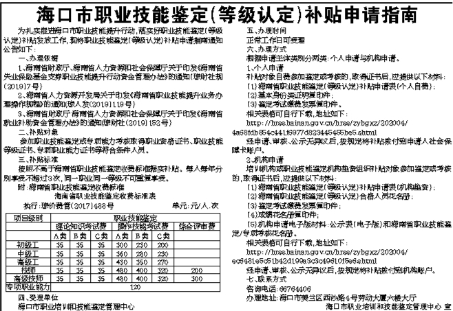 海口市职业技能鉴定(等级认定)补贴申请指南