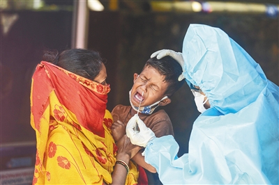 8月26日,在印度西里古里一处新冠病毒检测中心,一名工作人员给一个孩子进行检测采样。印度卫生部26日发布的数据显示,印度确诊病例总数和死亡病例总数分别升至3234474例和59449例。 新华社/法新