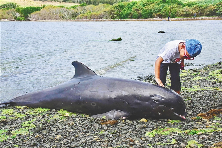 8月26日,一名男孩在毛里求斯大沙村查看被冲上岸边的瓜头鲸。
