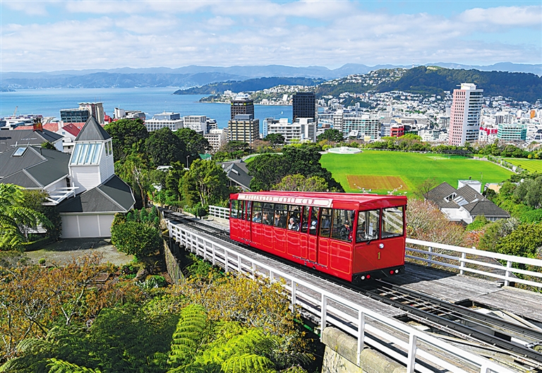 新西兰首都惠灵顿坐落于新西兰北岛的最南端,与南岛隔库克海峡相望,是往来南北岛的交通要冲。惠灵顿地处南纬41度左右,受咆哮西风带和海峡地形影响,四季多风且风力强劲,有“风都”之称。惠灵顿拥有美丽的海岸线,延绵起伏的山峦绿地。惠灵顿常住人口约40万,以浓厚的艺术氛围和遍布全城的咖啡馆闻名,市中心开设有大大小小的剧院、博物馆、画廊等艺术场所,曾被《孤独星球》旅行指南评选为新西兰首选旅行目的地,并被昵称为“最酷小首都”。 这是2018年9月15日,在新西兰惠灵顿,红色缆车驶向山顶。