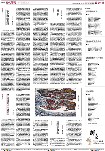 小时候,母亲白天忙完地里的活,晚上就在黯淡的海棠油灯下教我识字写字。海棠果成熟时,正值海南岛的台风季。因而,台风来临时,也正是拣海棠果的最好时机。每逢此时,我便与村里的放牛娃一道,穿上蓑衣,戴好斗笠,背起篓筐,顶风冒雨,高高兴兴地捡海棠果去。台风犹如猎兽,拼命地呼啸、咆哮、扫袭。树枝被折断,屋顶被掀翻,根基差点的大树也整棵地被拔起。豆粒般大的雨点像密集的砂粒,一阵紧跟一阵地向我们袭来,皮肉被打得生疼。篓筐、斗笠、蓑衣被吹跑,我们也被吹得连栽跟斗。但我们一摔倒很快又爬起来,赶快拣回蓑衣、斗笠、篓筐,踉踉跄跄地,又朝着海棠树成片的方向奔去。当看到吹落满地的海棠果,我们争着拣呀拣呀,任凭风吹雨打,毫不在乎,一直拣到满满一篓筐。