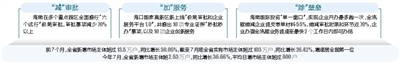 拓展:新项目建设稳步提速,截至7月底,全省今年新开工项目660个,同比增长5.3%;新增市场主体数量大幅增长,前7个月,全省新增市场主体超过13.5万户,同比增长30.05%,截至7月底全省实有市场主体超过103万户,同比增长26.42%,增速居全国第一位。通过推行极简审批、提升服务水平、促进部门联动等,海南“减”审批、“加”服务、“除”壁垒,推进制度集成创新、加快释放政策红利、实现部门高效协作,大力营造法治化、国际化、便利化的一流营商环境,推动高质量高标准建设海南自贸港。