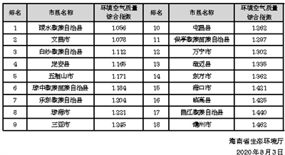 环境空气质量排名靠前的市县分别是陵水黎族自治县、文昌市和白沙黎族自治县,排名靠后的市县分别是儋州市、昌江黎族自治县和临高县。2020年6月全省18个市县(不含三沙市)环境空气质量排名如右: