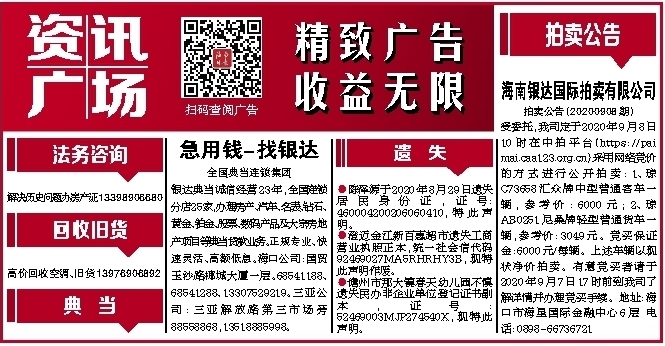 受委托,我司定于2020年9月8日10时在中拍平台(https://paimai.caa123.org.cn)采用网络竞价的方式进行公开拍卖:1、琼C73658汇众牌中型普通客车一辆,参考价:6000元;2、琼AB0251尼桑牌轻型普通货车一辆,参考价:3049元。竞买保证金:6000元/每辆。上述车辆以现状净价拍卖。有意竞买者请于2020年9月7日17时前到我司了解详情并办理竞买手续。地址:海口市海垦国际金融中心6层 电话:0898-66736721