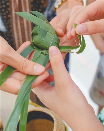 长长的椰子叶缠绕在灵巧的指尖,经过按压、挑起、翻转、穿插,不出几分钟,一只栩栩如生的粽子就出炉了。若不仔细看,还真怕有人误将其放进锅里煮了去,这其实是个草编织物。