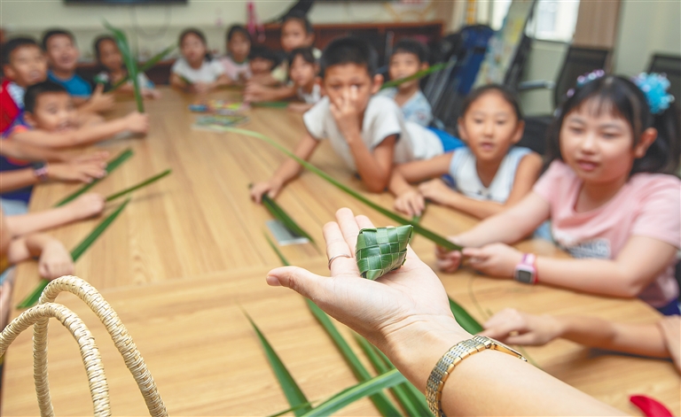 “已知的草编编织技法有两千多种,即使是最简单的作品,也会用到三至五种技法,初学者感到杂乱无章是正常的,这时候往往更考验耐力。”袁洁循循善诱,认真观察孩子们的动作,不停上前讲解、纠正,手把手亲自指导,原本被孩子们揉皱的草叶在她指尖舒展开来,经过数次有规律的穿插,粽子的轮廓逐渐明晰,孩子们也渐渐舒展开紧皱的眉头,兴致渐浓。