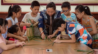 利用暑期开展“东山草编”公益课堂也是实践之一。这个8月,袁洁先后在秀英和琼山两区不同的地点,向200余名小学生做了12场次的非遗技艺培训。