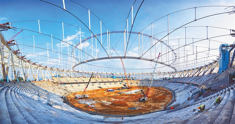 体育场整体外轮廓平面投影为不规则的倒角五边形,从体育场内的观众席处仰望,一根根钢索交织连接,各自用力拉伸,巨大钢网架跃然呈现,好似一座兼具了力学、美学、科技感的钢铁艺术品。文/本报记者 徐慧玲 欧英才 图/本报记者 封烁