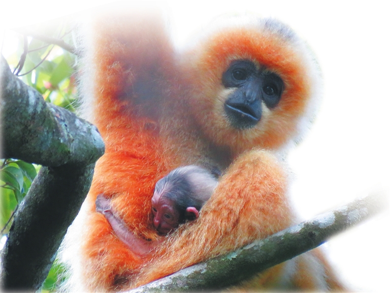毛色金黄的母猿蹲坐在枝丫间,怀里忽地露出一个粉嘟嘟、连毛发都还未长出的幼猿身影——8月29日上午9时许,海南长臂猿监测与研究人员在海南热带雨林国家公园体制试点区内的霸王岭林区东崩岭监测点监测海南长臂猿的第5个家族群(E群)时,强抑住兴奋,屏住呼吸拍下了这一幕。