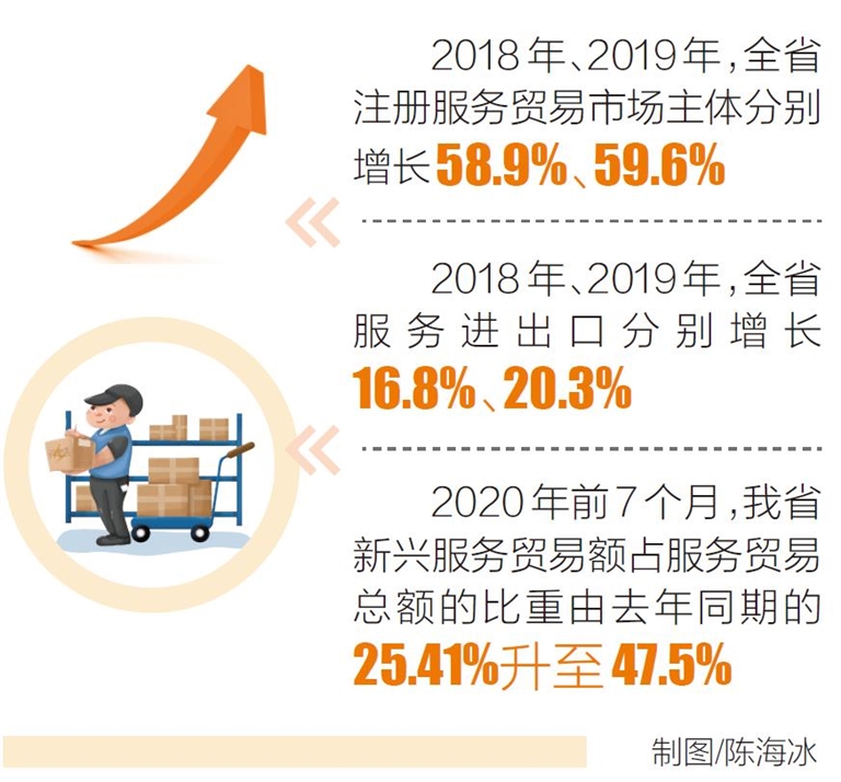 “4·13”以来,随着服务贸易营商环境的不断改善,我省服务贸易市场主体持续增长,2018年、2019年,全省注册服务贸易市场主体分别增长58.9%、59.6%。注册主体增加带来贸易量持续较高增长,2018年、2019年,全省服务进出口分别增长16.8%、20.3%,旅行、运输、知识产权使用、维修、电信计算机和信息服务等重点板块均持续快速发展。