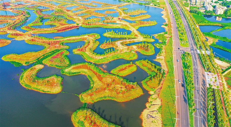 9月2日,俯瞰完成园林绿化种植的海口江东新区迈雅河区域生态修复项目示范区,绿意盎然景色尽收眼底。目前,该项目累计已完成1.2亿元投资,总施工进度已完成62%,计划今年底完工,高质量建成江东新区首个滨海生态休闲区。 本报记者 张茂 通讯员 王聘钊 图/文