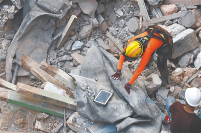 9月4日,一名救援人员在黎巴嫩贝鲁特发现生命迹象的居民区瓦砾中用追踪设备开展搜救工作。
