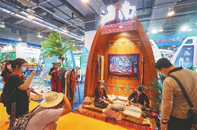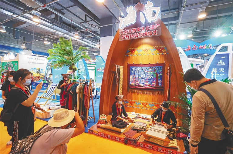 9月5日,在2020中国国际服务贸易交易会旅游服务专题海南展馆,观众在观看黎锦非遗技艺。 本栏照片均由本报特派记者 武威 摄