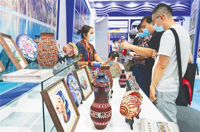 9月5日,在2020中国国际服务贸易交易会文化服务专题海南展馆,观众在了解特色彩雕。