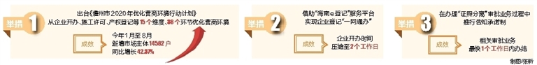 针对本市营商环境存在的不足,今年4月,儋州市政府出台《儋州市2020年优化营商环境行动计划》,以简化办事手续、减少办事时间、降低办事成本为着力点,深化“放管服”改革,推进“极简审批”改革,明确了两个优化营商环境的目标:到2020年底,营商环境相关领域的短板弱项明显减少,企业对营商环境优化的获得感和满意度显著提高;到2022年底,营商环境存在的痛点、难点、堵点基本清除,努力打造国内一流的法治化、国际化、便利化营商环境。从企业开办、施工许可、产权登记等15个维度、38个环节优化营商环境,吸引社会投资。今年1月至8月,该市新增市场主体14582户,同比增长42.37%。