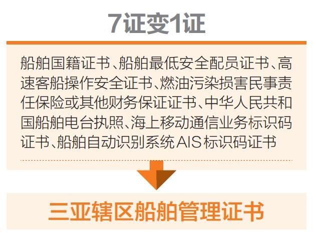 6月1日,《海南自由贸易港建设总体方案》发布,提出设立游艇产业改革发展创新试验区。为优化营商环境,三亚海事局在国家有关部委和海南海事局支持下,推行“多证合一”改革,对在三亚海事局登记并仅在三亚海事局管辖水域航行或作业的涉客游艇和船舶,涉及的船舶国籍证书、船舶最低安全配员证书、高速客船操作安全证书、燃油污染损害民事责任保险或其他财务保证证书、中华人民共和国船舶电台执照、海上移动通信业务标识码证书和船舶自动识别系统AIS标识码证书等7本法定证书中的重要信息进行整合,以1本三亚辖区船舶管理证书替代上述证书,统一有效期为5年。