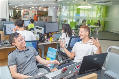 近日,在海口复兴城互联网信息产业园,巴西人欧力(前右)正在和合作伙伴讨论交流。 欧力从北京航空航天大学毕业后一直在北京中关村工作。今年8月,他迁来海口定居,在海口复兴城互联网信息产业园创立海南未来者科技有限公司。该公司利用大数据和人工智能平台,向客户提供技术服务。 据了解,6月1日《海南自由贸易港建设总体方案》公布后,海口复兴城互联网信息产业园着力提升人才服务水平,引进了一批国内外创新创业人才。