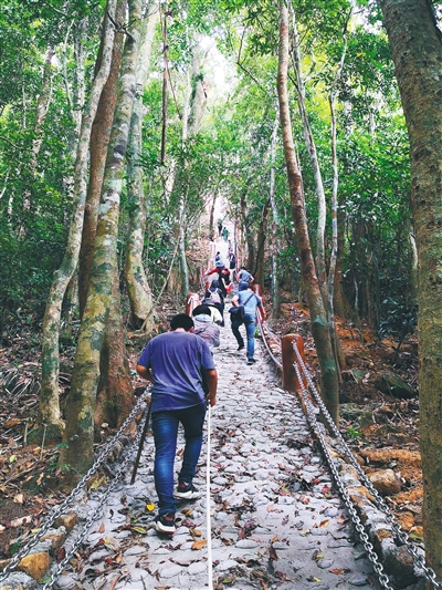 在黎母山,有一条新修建成的石头栈道。采访团成员从山脚开始,沿着栈道向上攀登。走了20多分钟的平缓道路之后,是一段117米长的陡坡,必须借助栈道上设置的绳子才能向长攀爬。