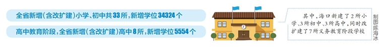 据统计,义务教育阶段,全省新增(含改扩建)小学、初中共33所,新增学位3.4324万个;高中教育阶段,全省新增(含改扩建)高中8所,新增学位5554个。其中,海口、临高、乐东等市县建设力度最大,仅海口就新建了2所小学、3所初中、3所高中,同时改扩建了7所义务教育阶段学校。