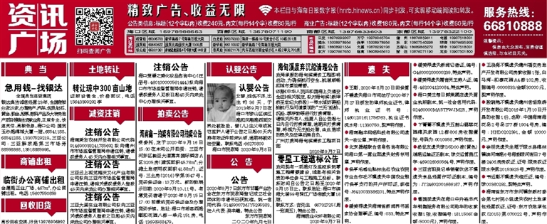 受委托,定于2020年9月16日15:30在本司公开拍卖: 三亚市河东区榆亚大道嘉宾国际酒店A区3205房(建筑面积45.78m2;分摊土地使用权面积41.88m2),证号:三土房(2016)字第3547号。竞买保证金:10万元。标的物展示日期:2020年9月10、11号。有意竞买者请于2020年9月15日17:00前缴纳竞买保证金及办理竞买手续。地址:海口市希客西路颐和花园八栋一单元151房,电话:13698988479。