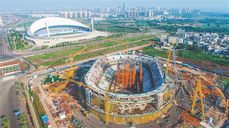 俯瞰雏形初现的海口五源河文体中心二期项目。目前,该项目总进度已过半,预计2021年12月底竣工交付。