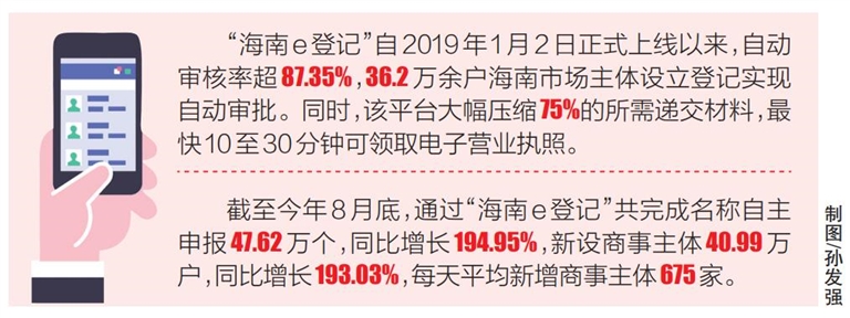 这样的例子在海南有很多。据省市场监管局统计,“海南e登记”自2019年1月2日正式上线以来,自动审核率超87.35%,36.2万余户海南市场主体设立登记实现自动审批。同时,该平台大幅压缩75%的所需递交材料,最快10至30分钟可领取电子营业执照。