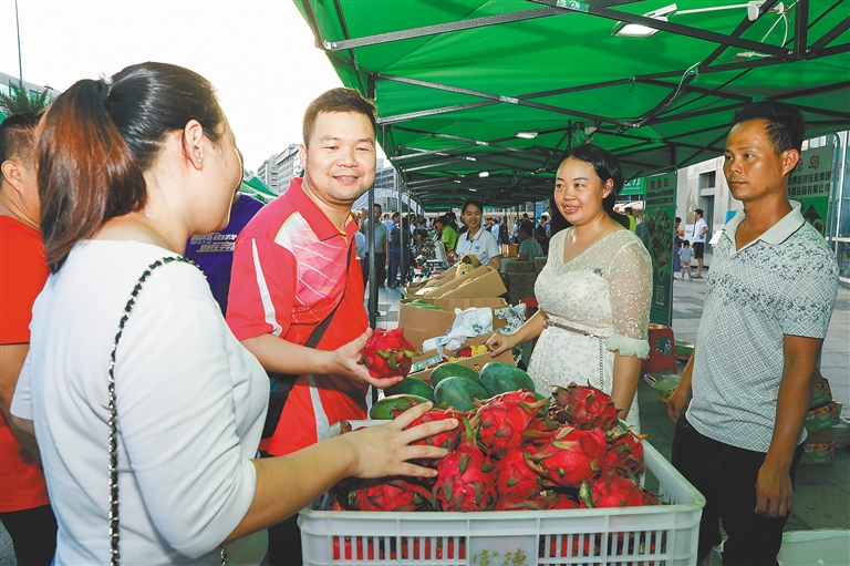 这样的热闹场景出现在多次扶贫集市中,海南农垦的各类扶贫农产品因口味好、品质佳、品牌硬等特点受到消费者的欢迎。