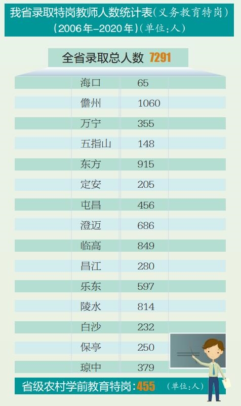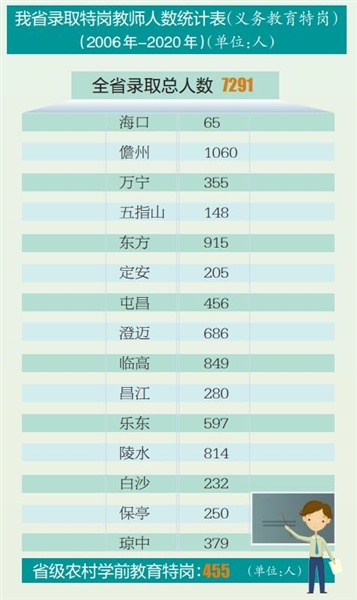 本报海口9月9日讯(记者陈蔚林)自2006年国家实施农村义务教育学校特设岗位教师计划以来,我省每年组织公开招聘高校优秀毕业生担任特设岗位教师,到县以下农村义务教育阶段学校任教,从2016年起我省又进一步增设了省级乡镇公办中心幼儿园特岗教师计划,引导和鼓励高校优秀毕业生从事农村教育工作。