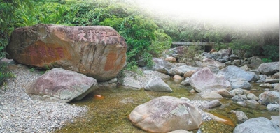 五指山东南麓,琼中上安乡仕阶村畔,跨过编号为“26”的国家公园界碑后,耳畔忽地传来哗啦啦的流水声。再往前走数百米,一座小桥乍现,拨开桥边丛林小径的荆棘,攀着乱石下至溪涧,“手辟南荒”“一手撑天”“百越锁钥”“巨手擎天”等摩崖石刻群顿时跃入眼帘。