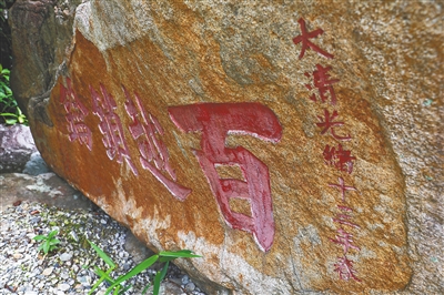 从石刻内容可知,这是清代名将冯子材及属僚开通以五指山为中心的“十字路”后的题书志庆。字大如斗,入石五分,山石的粗砺与笔画的粗犷相得益彰,将镌刻者彼时的豪迈之情展露无遗,不禁让人联想:当年庆功的欢呼声是不是曾响彻山谷?