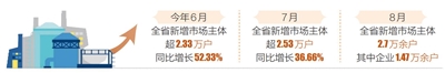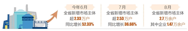 统计数字显示,今年6月,全省新增市场主体超2.33万户,同比增长52.33%。7月,全省新增市场主体超2.53万户,同比增长36.66%。8月,全省新增市场主体2.7万余户,其中企业1.47万余户,同比增长250.76%。