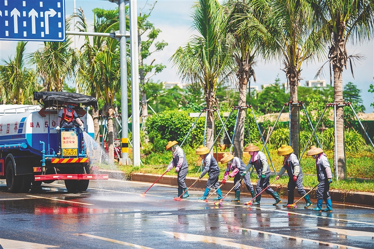 9月10日,在海口市江东大道,桂林洋开发区园林环卫部的工作人员对市政道路及配套设施进行清洁。据了解,海口不断推进城市环境的净化、绿化、彩化、亮化、美化,持续巩固好创文创卫成果,以点带面提升城市生态文明建设水平,努力营造干净整洁优美的城市环境。
