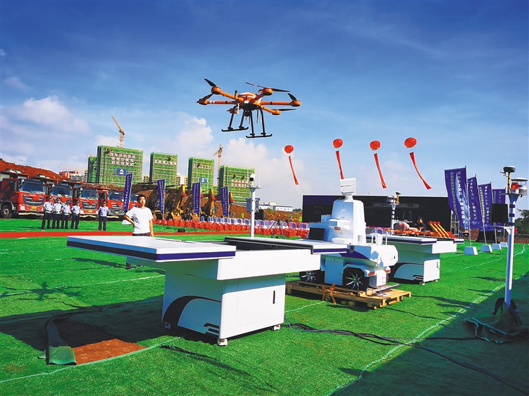 当天,三生万物公司将该公司生产的无人机和智能巡检机器人等产品带到了现场,引起现场人员驻足参观。工作人员还在现场操控无人机进行空中巡检的工作状态:一台名为“无人值守机舱”平板缓缓打开,一架无人机从机舱里升起,启动后升空巡检。“机舱可以安放在海边或荒山野岭里,使用时只需通过电脑操控即可。”三生万物工作人员介绍道。