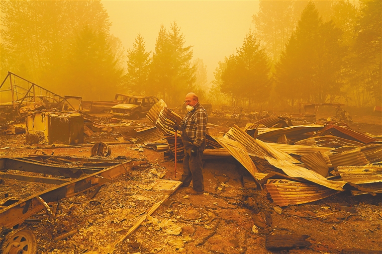 连日来,美国西海岸加利福尼亚州、俄勒冈州等多地山火持续侵袭。根据当地官方公布的最新数据,山火已造成24人死亡,数十人下落不明。图为9月12日,在美国俄勒冈州米尔城,一名男子站在房屋废墟中。 新华社/美联