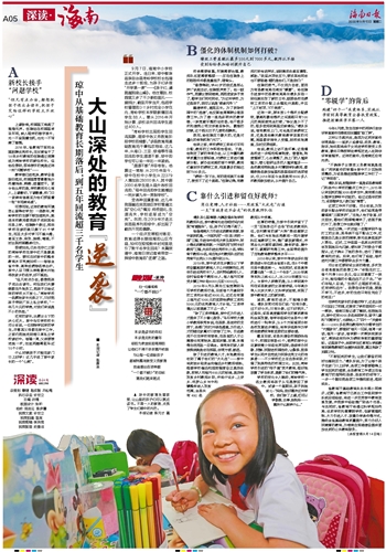 在学校和家长的多番劝导下,这名女孩不仅回归了校园,还接受了学校老师的一对一帮扶。海南日报记者了解到,包括她在内,琼中还有6000多名贫困学生、留守儿童和“问题学生”,也被纳入了“四个一”关爱体系——2000多名责任教师作为分管学生的“代理家长”,要做到“每天一见面,每周一谈话,每月一家访,每学期一次帮扶效果评估”,帮扶成效则作为绩效考核的重要指标。这些孩子中,贫困学生还享有从学前教育到高等教育的全套扶贫政策,真正免除了后顾之忧。