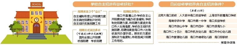 按照界定范围,目前海口可进行自主招聘的学校共有15所。因《实施意见》只界定了类型,符合条件的学校名单可调整变动。此外,海口将按照学校办学水平给予自主招聘权,鼓励其余普通学校不断提升办学水平,获得自主招聘权。